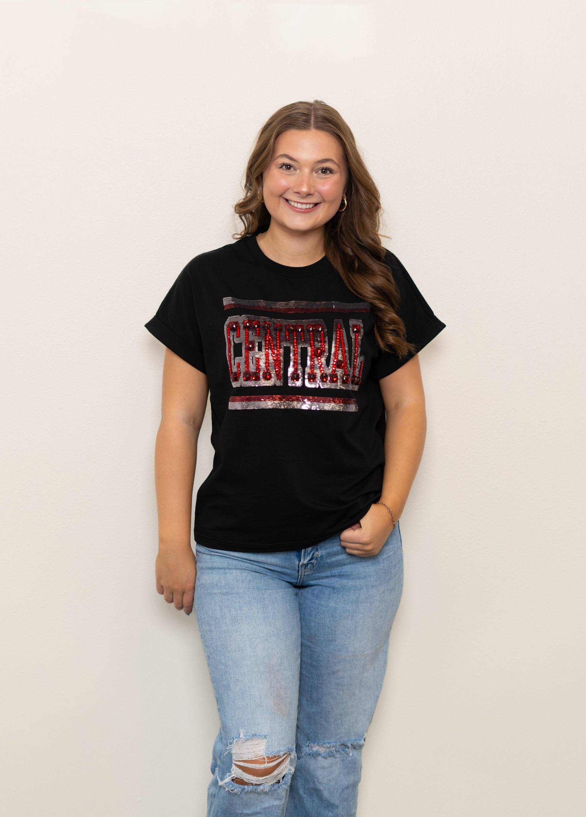 **PRE-ORDER ONLY** Jeweled Central | Women's Sequin + Jewel Design Cuff Sleeve Tee (Black)