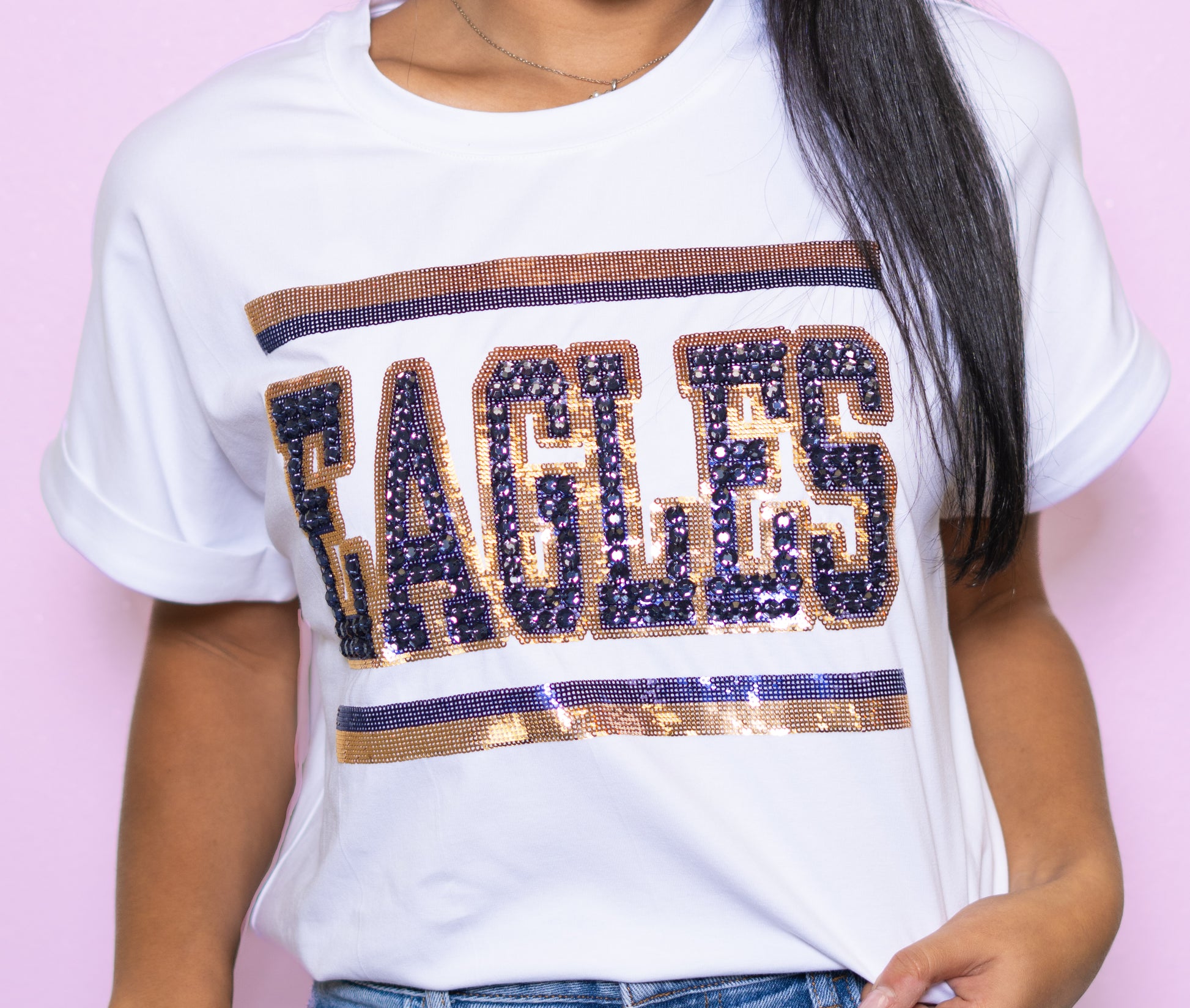 **PRE-ORDER ONLY** Jeweled Eagles Navy/Gold | Women's Sequin + Jewel Design Cuff Sleeve Tee (White)