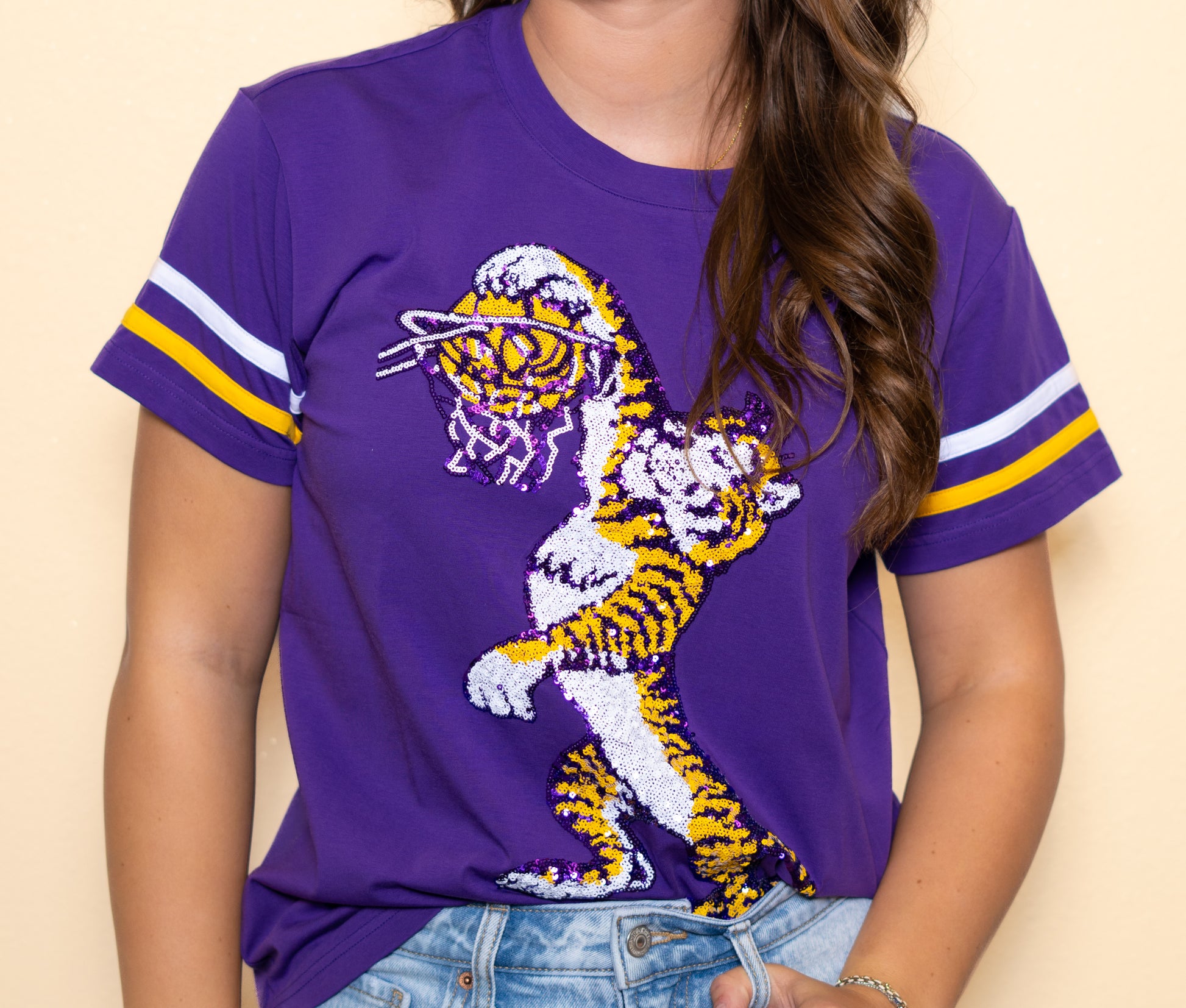 **PRE-ORDER ONLY** LSU Vintage Basketball (Licensed) | Women's Sequin Design Tee with Varsity Stripes (Purple)