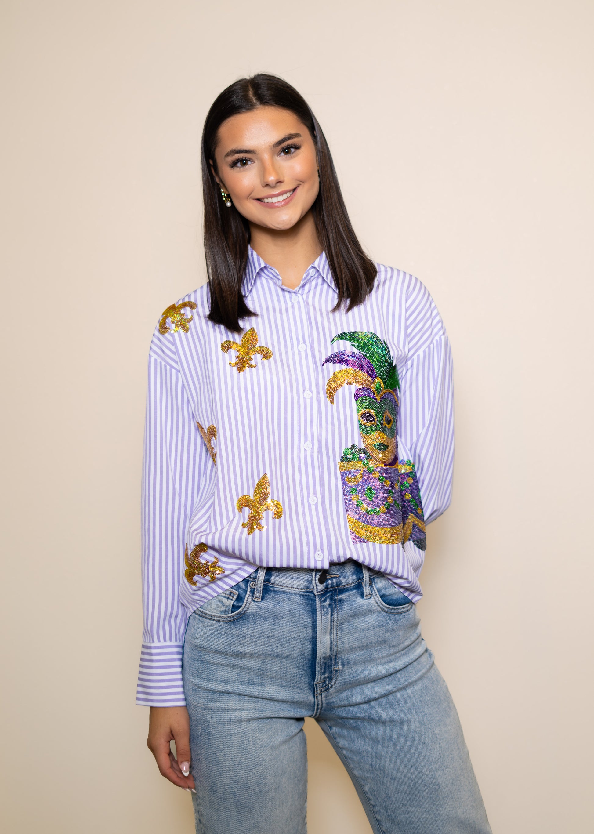 Stand out this season in this striped button-down featuring vibrant sequin embroidery with a wrap-around Mardi Gras float and sparkling fleur-de-lis accents. A festive blend of classic style and bold celebration flair!