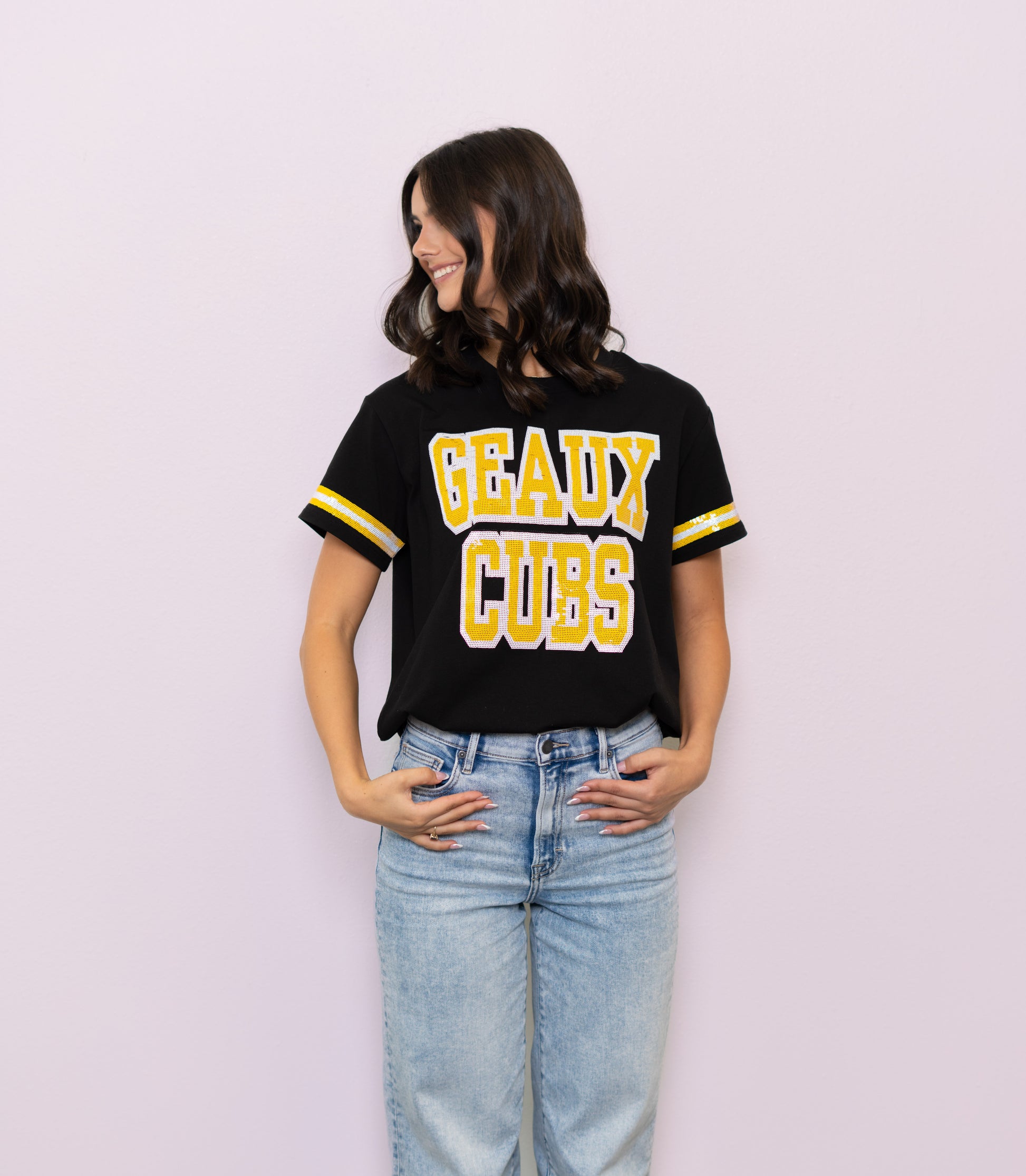 **PRE-ORDER ONLY** University Lab School | Geaux Cubs | Women's Sequin Design Jersey Tee (Black)