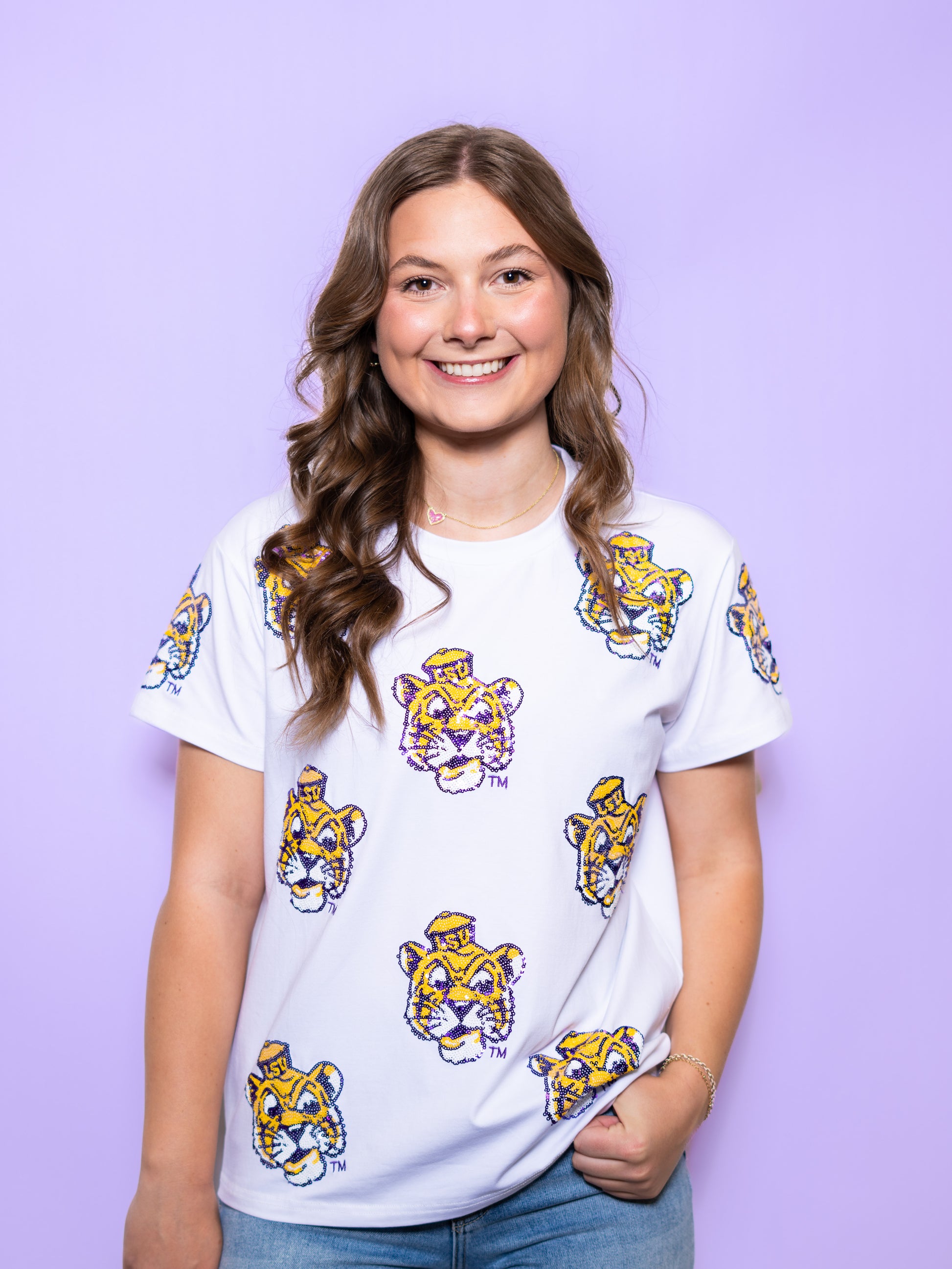 Wholesale | LSU Scattered Vintage Logo (Licensed) | Women's Sequin Design (White)