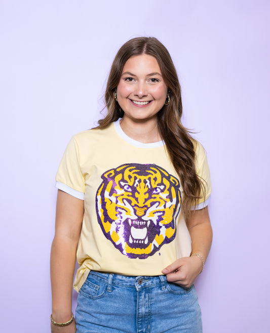Louisiana State University Tiger (Licensed) | Women's Sequin Design Tee (Butter Yellow)