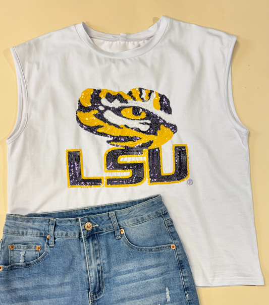 LSU Tiger Eye (LICENSED) | Women's Sequin Design Boxy Tank (White)