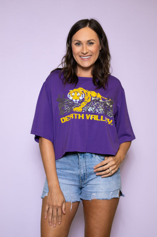 Mike Over Tiger Stadium LSU (LICENSED) | Women's Oversized Sequin Design Tee (Purple)