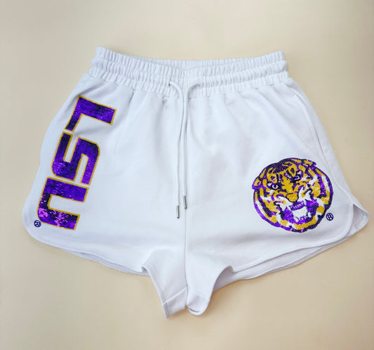 LSU TIGERS Jogger Shorts (Licensed) | Women's Sequin Design Shorts (White)