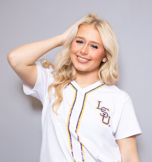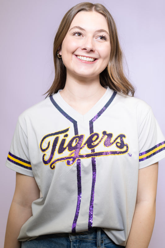 **PRE-ORDER ONLY** Wholesale | LSU Tigers (Licensed) | Women's Sequin Embroidery Baseball Jersey (Grey)