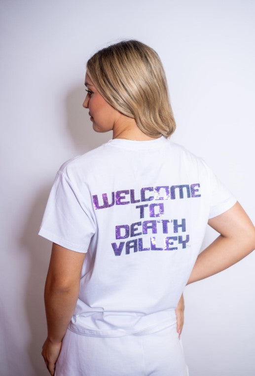 LSU Tigers Welcome to Death Valley (Licensed) | Women's Sequin Design Tee (White)