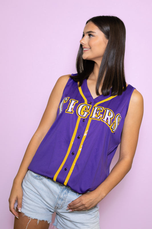 **PRE-ORDER ONLY** LSU Tigers (Licensed) | Women's Sequin Embroidery Baseball Jersey Tank (Purple)