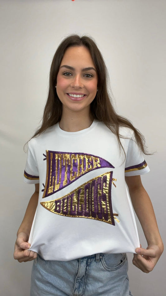 Lutcher Bulldogs Pennant Tee | Women's Sequin Design Tee (White)