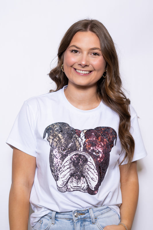 Jeweled Bulldogs | Women's Sequin + Jewel Design Cuff Sleeve Tee (White)