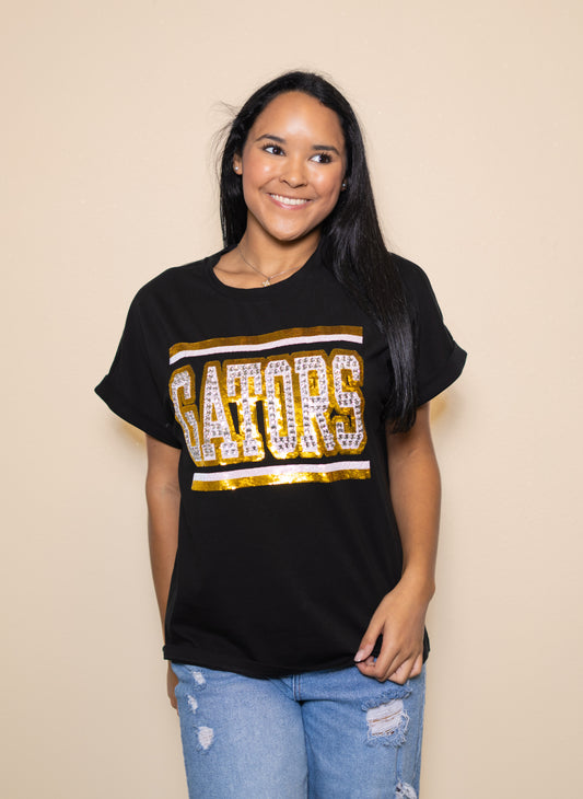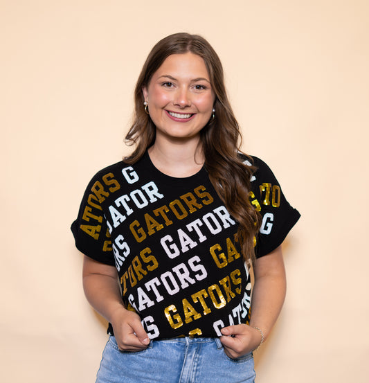 Jeweled Gators | Women's Sequin + Jewel Design Cuff Sleeve Tee (Black)
