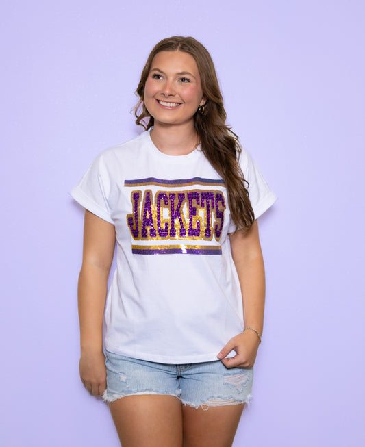 Jeweled Jackets Purple & Gold | Women's Sequin + Jewel Design Cuff Sleeve Tee (White)