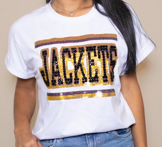 Jeweled Jackets Black & Gold | Women's Sequin + Jewel Design Cuff Sleeve Tee (White)