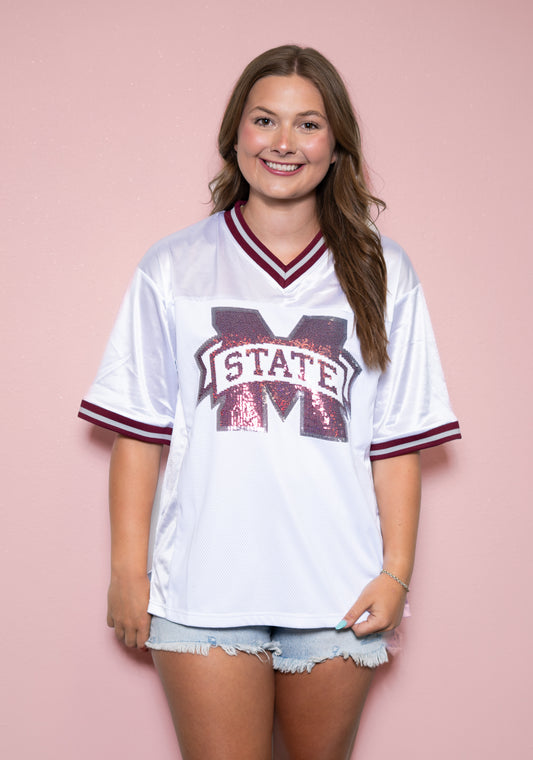 Mississippi State (Licensed) | Women's Sequin Design Football Jersey (White)