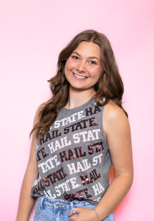 Mississippi State University Hail State Varsity Block (LICENSED) | Women's Sequin Design Tank (Grey)