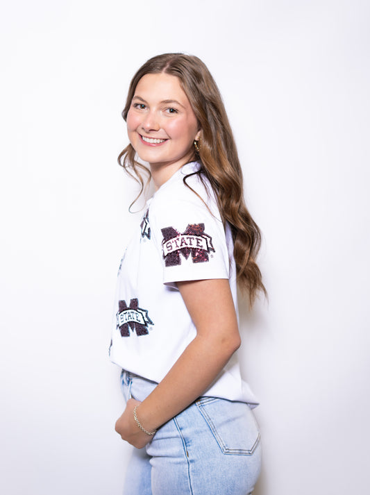 Mississippi State Scattered M Logo (Licensed) | Women's Sequin Design Tee (White)