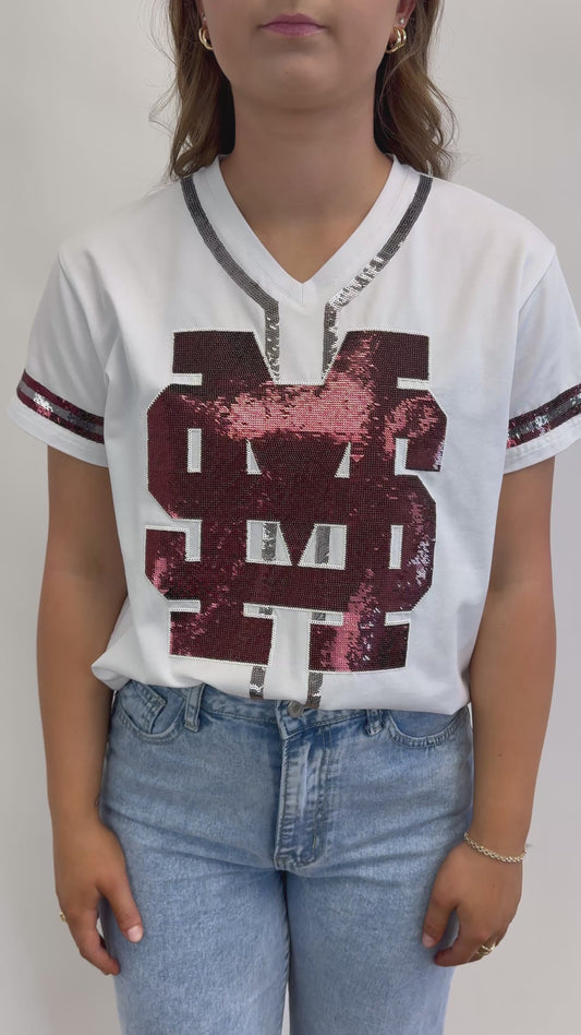 Mississippi State (LICENSED) | Women's Sequin Design Baseball Jersey V-Neck Tee (White)