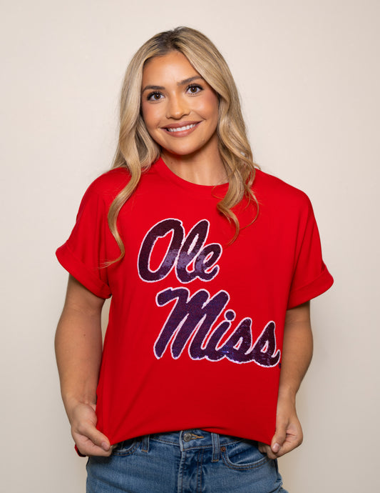 Ole Miss (LICENSED) | Women's Sequin Design Cuff Sleeve Tee (Red)