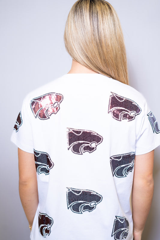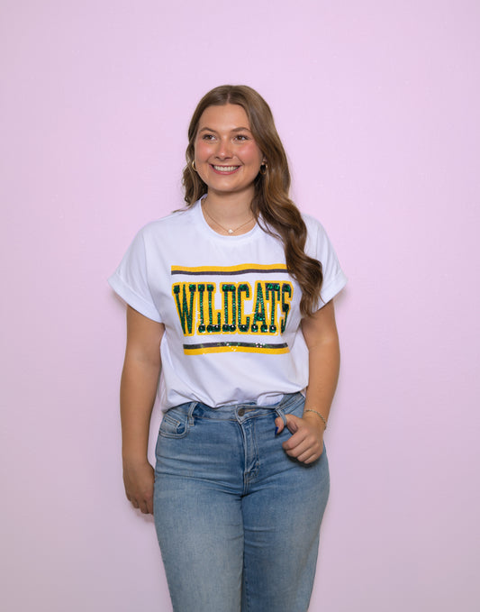 Jeweled Wildcats | Women's Sequin + Jewel Design Cuff Sleeve Tee (White)